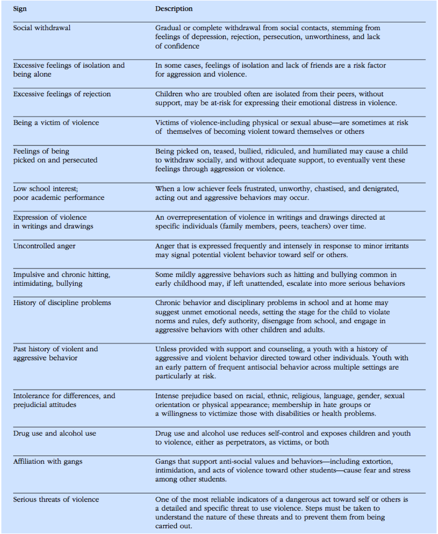 These warning signs simply mean that a child appears to be troubled, and violence might be one of the possible outcomes of this distress. Neither stigmatize children nor assume that they will be violent just because they are at risk for such behavior. Other warning signs may also exist. Consequently, this list should not be considered all-inclusive, and certain items and combinations may be far more indicative of a potential problem than others. The signs include: